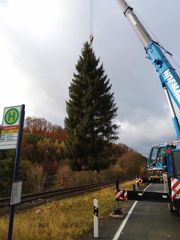 Da die Bahnlinie aufgrund der Arbeiten im Ellerinhausener Tunnel bei Brilon-Wald in dieser Woche noch für den Zugverkehr gesperrt ist, wurde der Weihnachtsbaum in diesem Jahr ca. eine Woche früher geholt. Nach der Fällung transportierte der Bauhof den Baum zum Marktplatz, wo er am 09.11.2023 mit einem 60 t Autokran in den extra für den Weihnachtsbaum vorhandenen Betonschacht gestellt wurde. Die Waage des Autokrans hat ein Gewicht von 3,5 t für den Baum ermittelt.